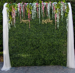 *Comes with everything in picture, including small donut wall and the 8'x8' Green Boxwood Hedge Backdrop or Flower Wall Backdrop