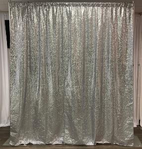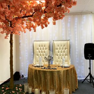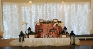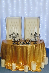 Includes: Sheer White Lighted Backdrop, 2 Throne Chairs, Sweetheart Table, Sequin Linen.