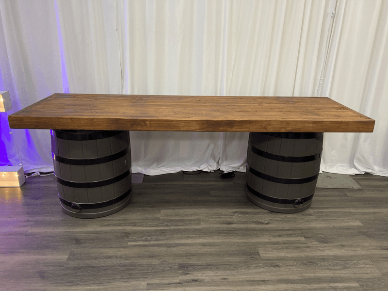 * This is a beautiful, faux rustic wine barrel bar! (1 side of each barrel is flat). These are very heavy items and require delivery. Includes 2 faux wine barrels and real wood bar top!