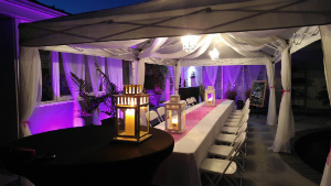 * This package includes everything for a memorable, 18-20 person small party event! Canopy, tables, chairs, linens, napkins, cocktail tables, bar, candles, uplighting, pole drapery, glassware, dinnerware, and flatware, are all included.